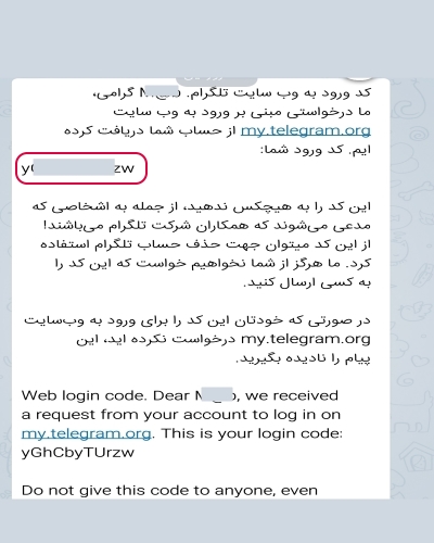 به تلگرام بروید و کد تاییدیه ارسالی همانند تصویر را یادداشت کنید و مجدد به اکانت خود مراجعه نمائید .دقت نمائیدکه در برخی از کد های ارسالی ، حروف بزرگ لاتین وجود دارد که پنجره اکانت به حروف حساس است پس شما باید عینا کد را بنویسید