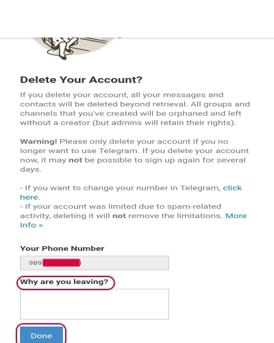 در این پنچره با کلیک کردن روی دکمه Done درخواست شما برای حذف تلگرام به سرور ارسال می شود و به سرعت اکانت شما حذف خواهد شد منظور عبارت why are you leaving دلیل حذف تلگرام است که اختیاری می باشد می توانید این قسمت را خالی بگذارید .