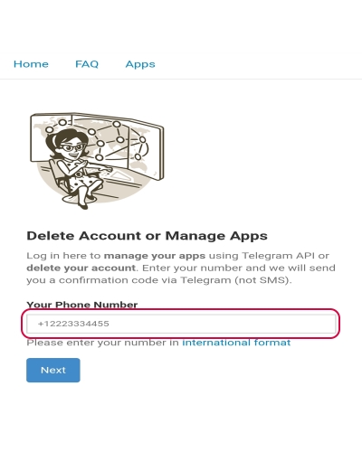 این صفحه ورود جهت حذف اکانت است شما باید در این صفحه و در قسمت مشخص شده شماره همراه خود را وارد نمائید شماره همراهی که تلگرام را با آن فعال نموده اید . بدون صفر اول و با افزدون 98+ به اول شماره . مثال اگر شماره شما 01234567891 به صورت 981234567891+ بنویسید و روی NEXT کلیک کنید