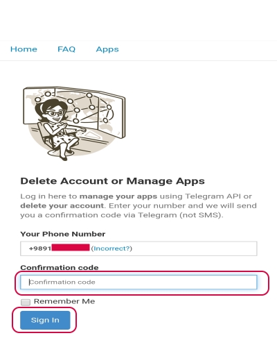 کد دریافت شده از طرف تلگرام را در قسمت مشخص شده بنویسید و روی دکمه sign in کلیک کنید