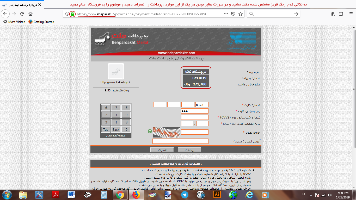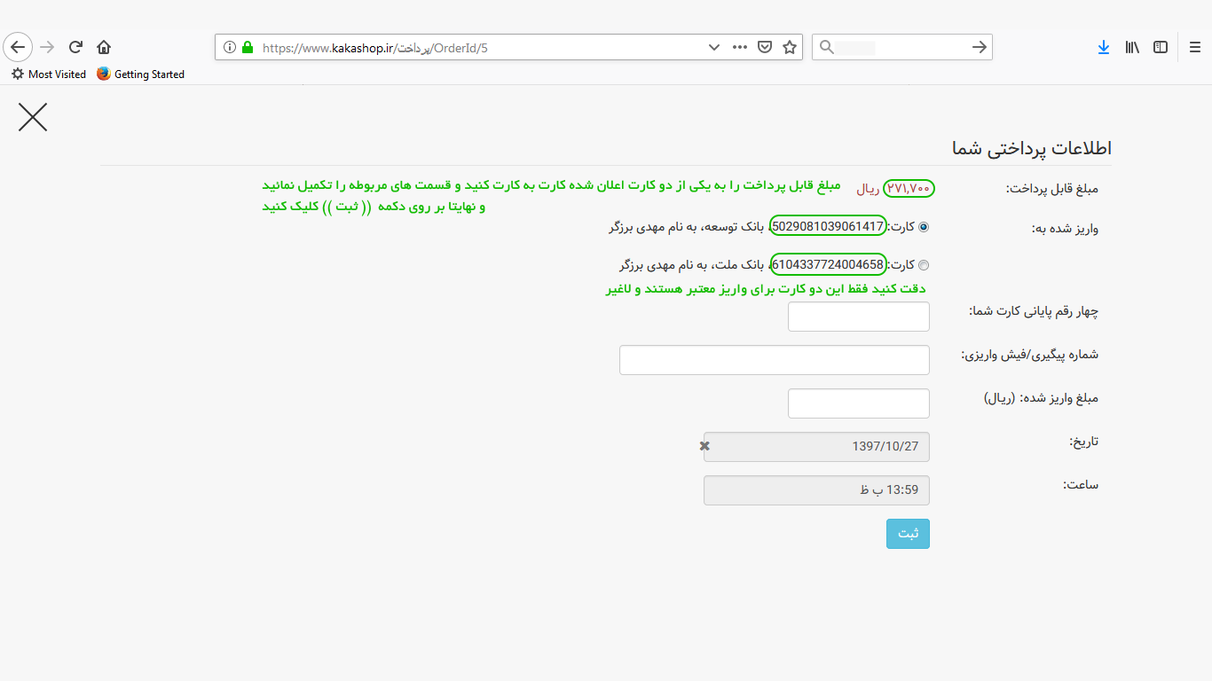 لطفا برای پرداخت در هریک از دو روش زیر ، به نام مالک فروشگاه و صاحب کارت دقت نمائیدو در صورت مشاهده اطلاعاتی غیر از موارد زیر پرداخت خود را انصراف دهید و موضوع را به فروشگاه اطلاع رسانی کنید